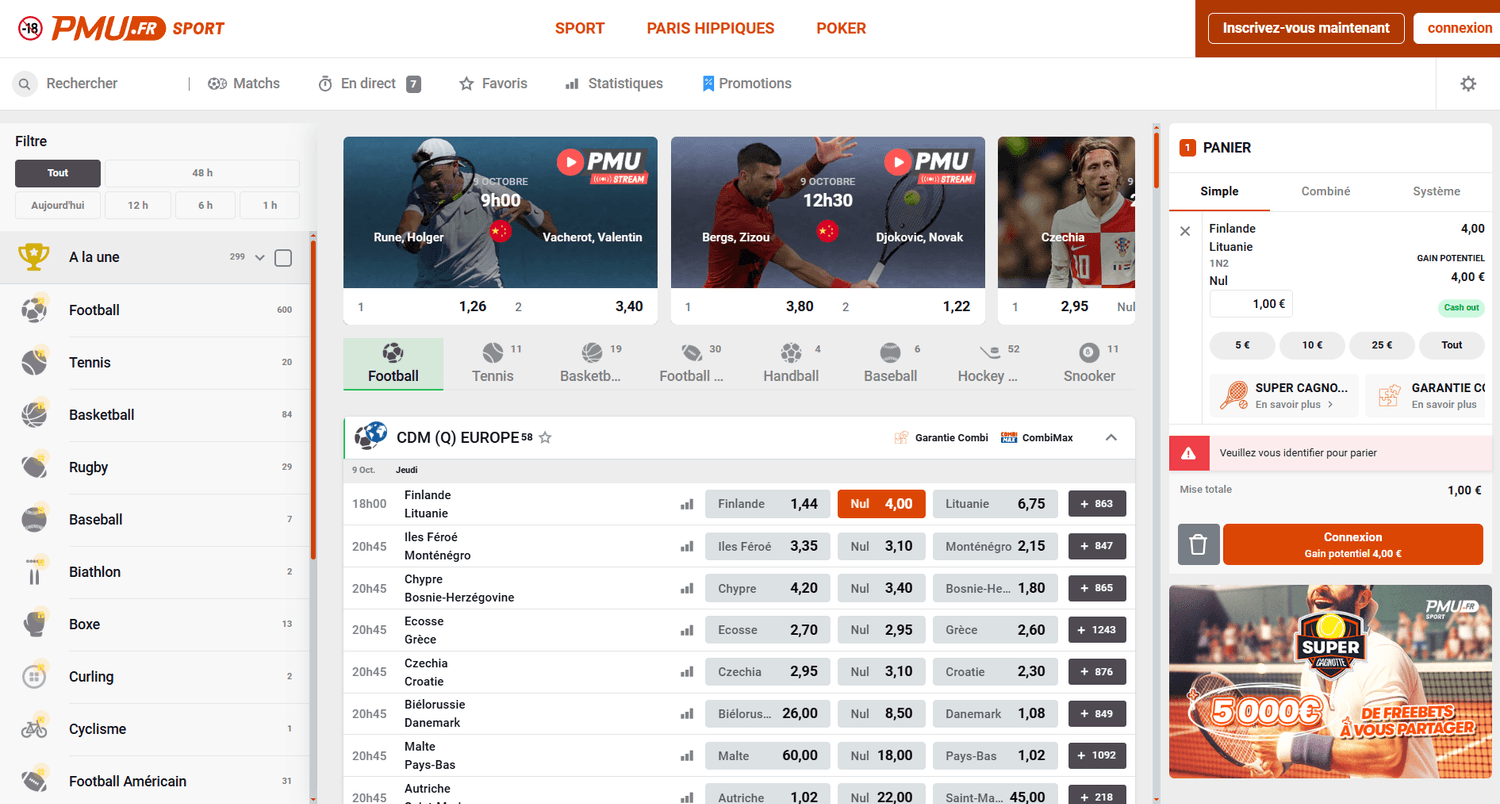 PMU Sport offre des cotes correctes et régulièrement mises à jour, surtout sur les grands championnats européens.